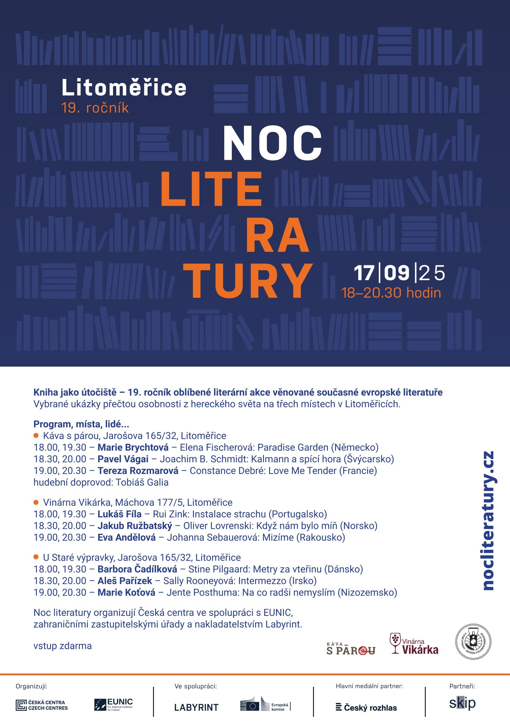 I letos vás čeká večer věnovaný současné evropské literatuře. Ukázky z děl současných evropských autorů a autorek přečtou osobnosti z hereckého světa.